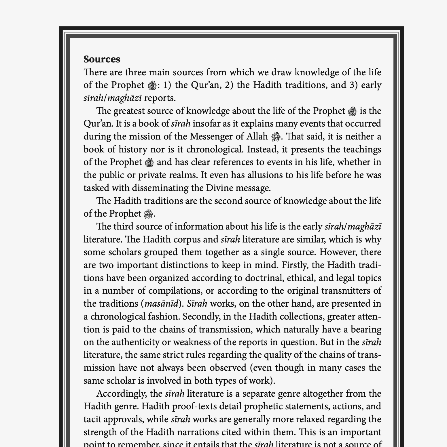 A sub-genre within the field of Prophetic studies, the maghāzī literature covers the battles and military expeditions of the Prophetic era, and by extension, the biography of the Prophet ﷺ as well. The maghāzī literature is thus both historical and religious in its scope. What sets The Maghāzī of Sayyidunā Muhammad ﷺ apart, even among the works of maghāzī and sīrah, is the fact that its author was a muhaddith first and foremost, and as such, adhered to strict requirements for documentation of both narrators and narrations in his works. The result is that his Maghāzī is a work of history that is documented almost to the same standards as a work of hadith.